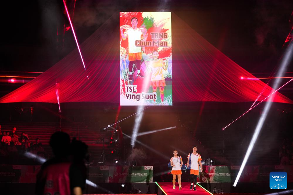 Tang Chun Man (R)/Tse Ying Suet of China's Hong Kong enter the court before the mixed doubles final match against Jiang Zhenbang/Wei Yaxin of China at the Japan Badminton Open 2024 in Yokohama, Japan, Aug. 25, 2024. (Xinhua/Zhang Xiaoyu)