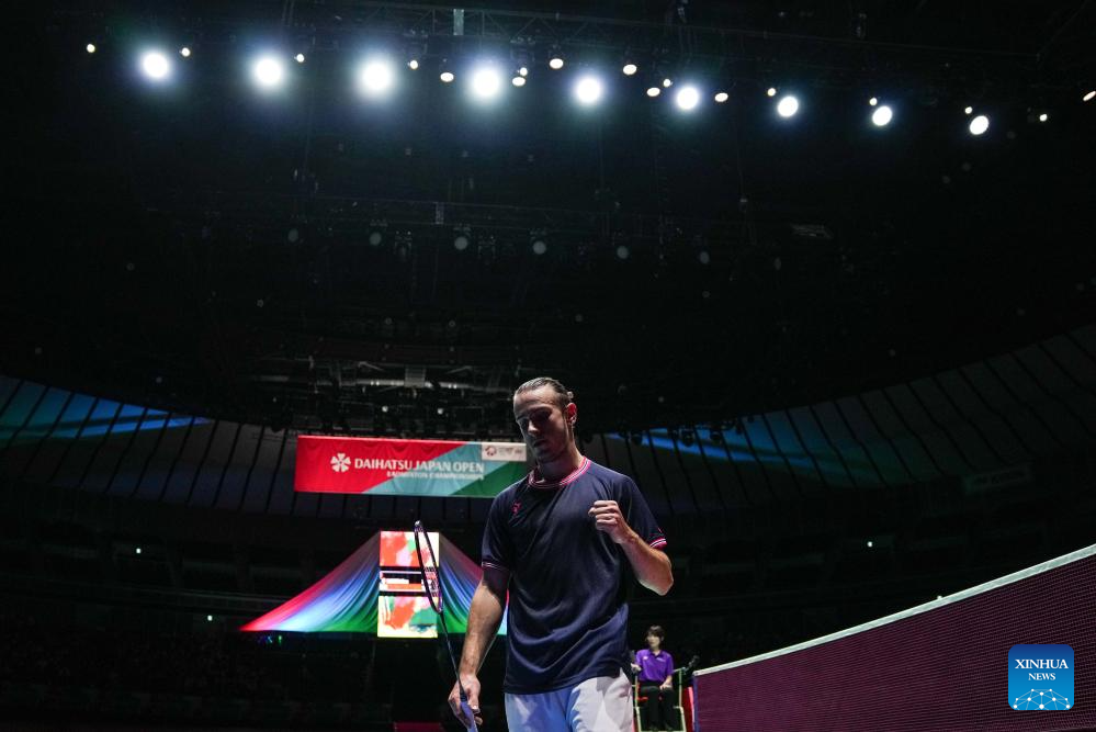Alex Lanier of France reacts during the men's singles final match against Chou Tien-Chen of Chinese Taipei at the Japan Badminton Open 2024 in Yokohama, Japan, on Aug. 25, 2024. (Xinhua/Zhang Xiaoyu)