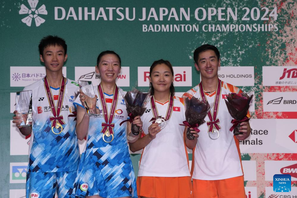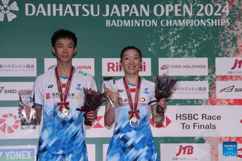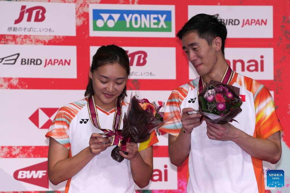 Winners Jiang Zhenbang (L)/Wei Yaxin of China pose for photos during the victory ceremony for the mixed doubles event at the Japan Badminton Open 2024 in Yokohama, Japan, Aug. 25, 2024. (Xinhua/Zhang Xiaoyu)