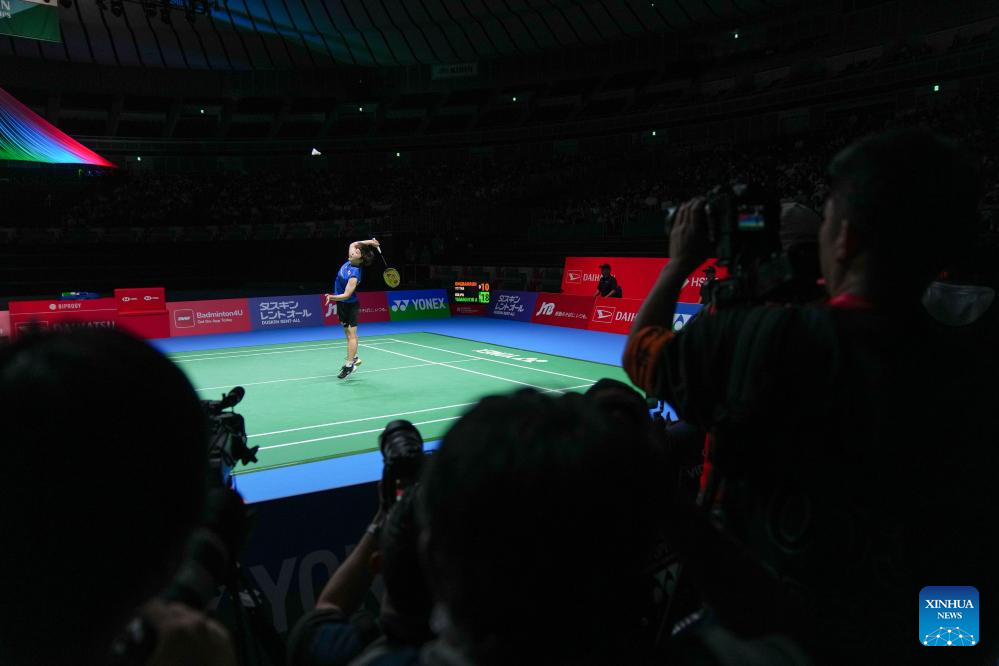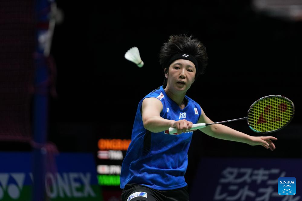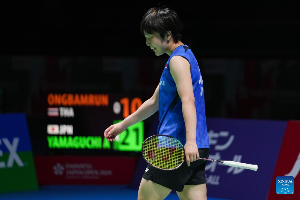 Yamaguchi Akane of Japan competes during the women's singles final match between Busanan Ongbamrungphan of Thailand and Yamaguchi Akane of Japan at the Japan Badminton Open 2024 in Yokohama, Japan, Aug. 25, 2024. (Xinhua/Zhang Xiaoyu)