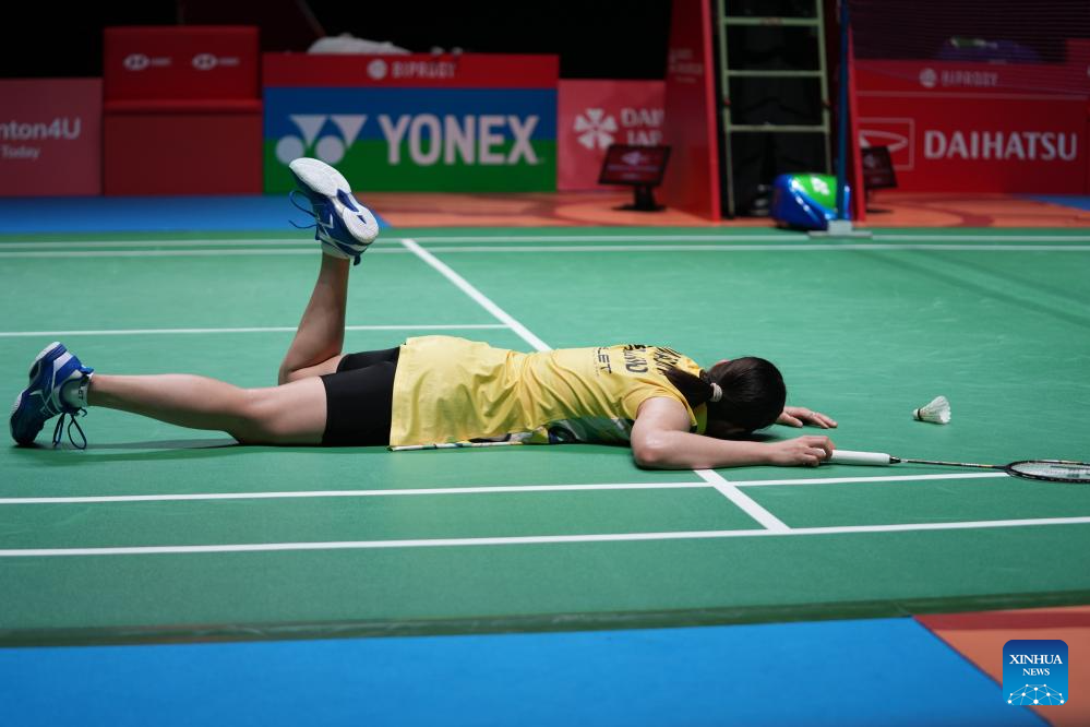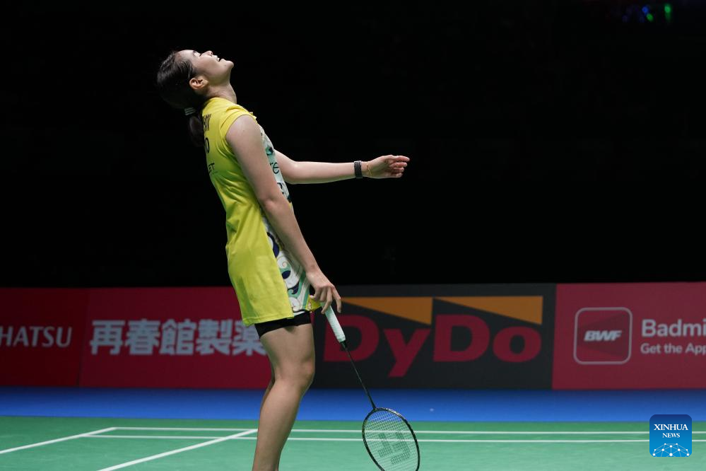 Busanan Ongbamrungphan of Thailand reacts during the women's singles final match between Busanan Ongbamrungphan of Thailand and Yamaguchi Akane of Japan at the Japan Badminton Open 2024 in Yokohama, Japan, Aug. 25, 2024. (Xinhua/Zhang Xiaoyu)