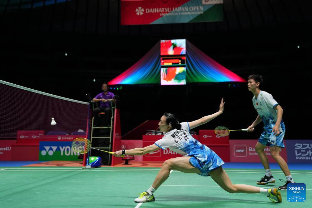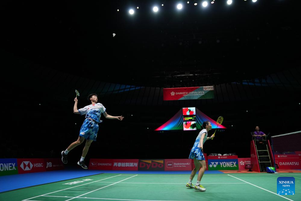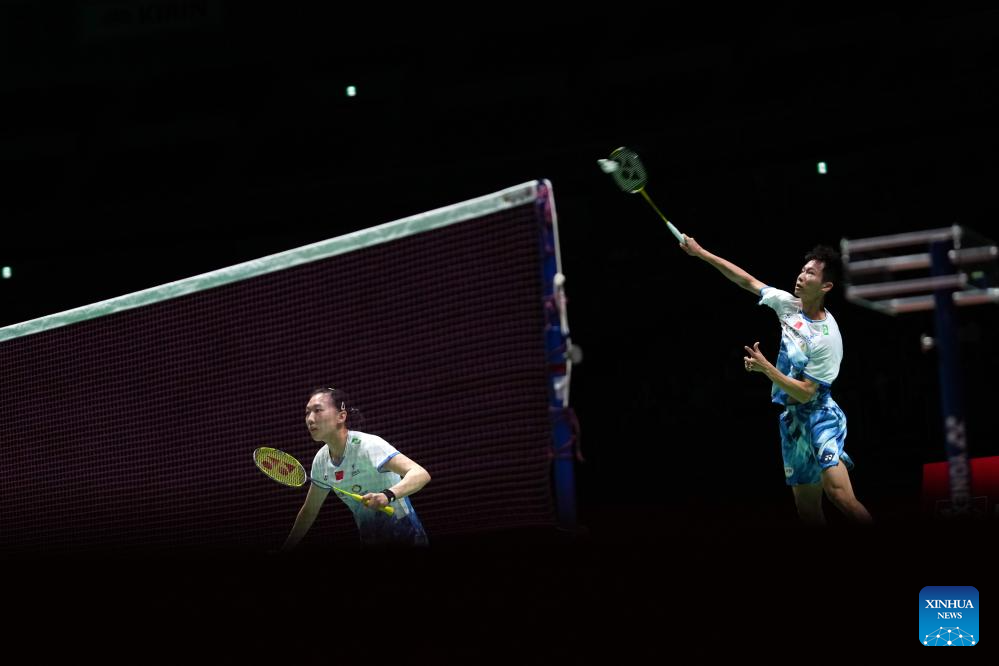 Jiang Zhenbang (L)/Wei Yaxin of China compete during the mixed doubles final match against Tang Chun Man/Tse Ying Suet of China's Hong Kong at the Japan Badminton Open 2024 in Yokohama, Japan, Aug. 25, 2024. (Xinhua/Zhang Xiaoyu)