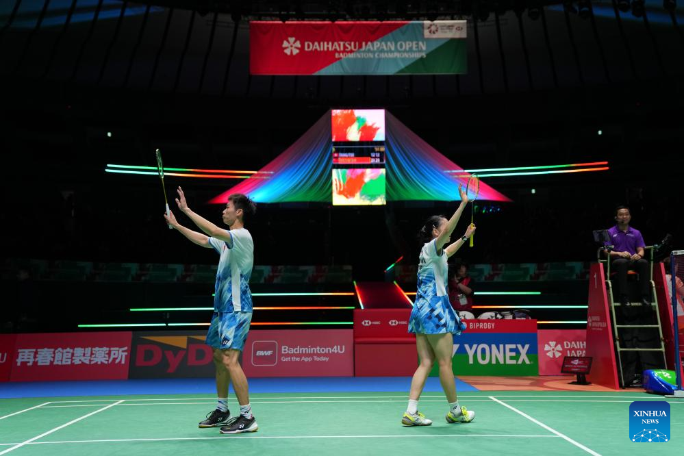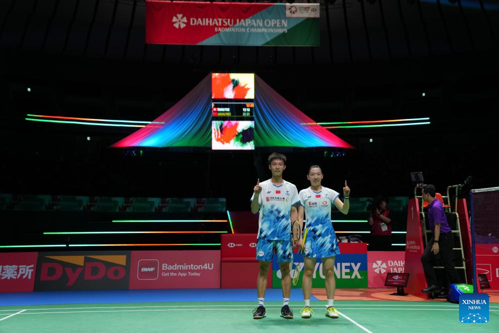 Jiang Zhenbang (L)/Wei Yaxin of China celebrate after winning the mixed doubles final match against Tang Chun Man/Tse Ying Suet of China's Hong Kong at the Japan Badminton Open 2024 in Yokohama, Japan, Aug. 25, 2024. (Xinhua/Zhang Xiaoyu)