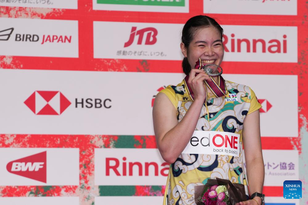 Busanan Ongbamrungphan of Thailand reacts during the awarding ceremony of women's singles at the Japan Badminton Open 2024 in Yokohama, Japan, Aug. 25, 2024. (Xinhua/Zhang Xiaoyu)
