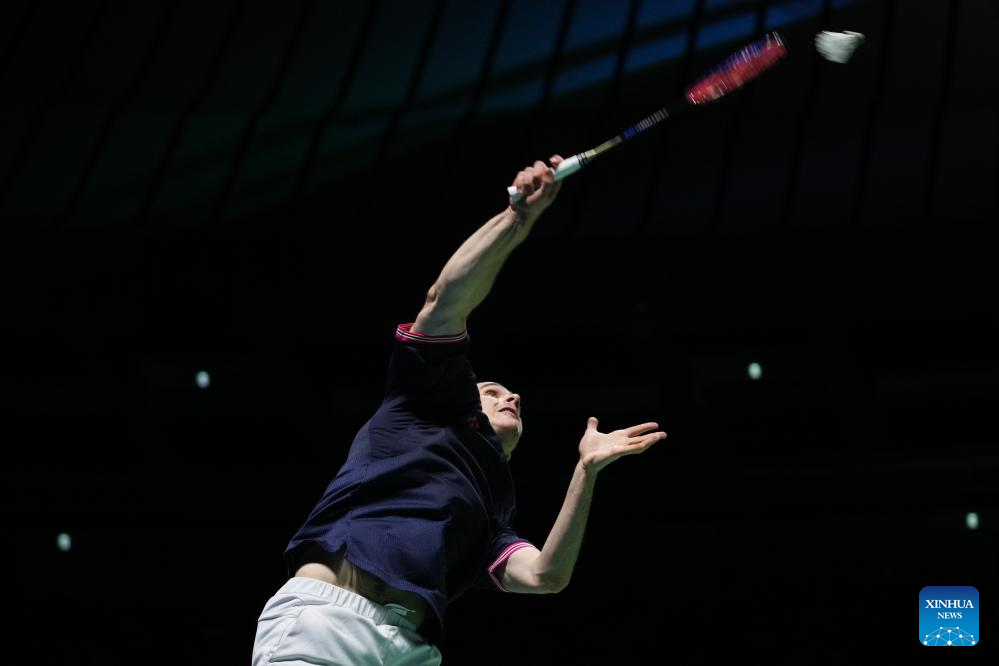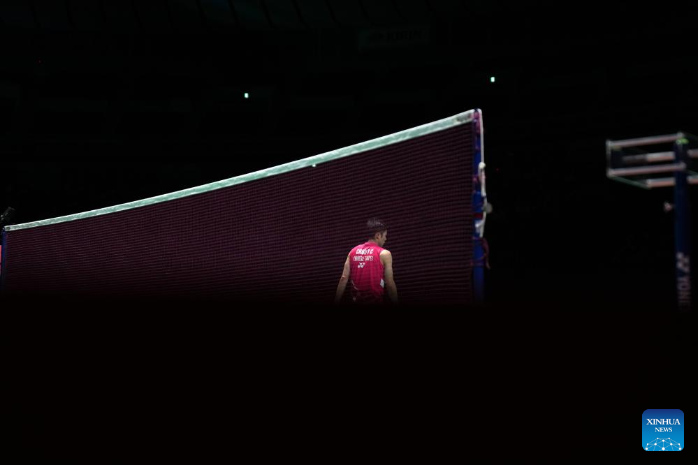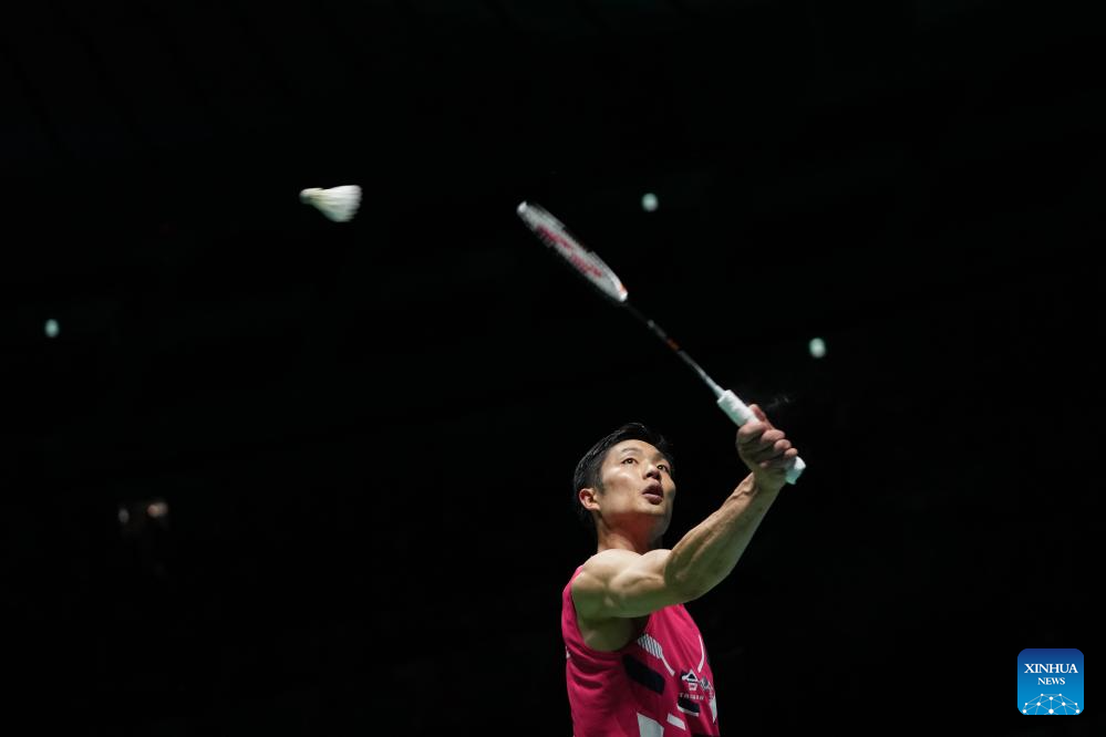 Chou Tien-Chen of Chinese Taipei hits a return during the men's singles final match against Alex Lanier of France at the Japan Badminton Open 2024 in Yokohama, Japan, on Aug. 25, 2024. (Xinhua/Zhang Xiaoyu)