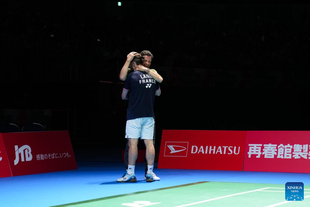 Alex Lanier (front) of France celebrates with his coach after winning the men's singles final match against Chou Tien-Chen of Chinese Taipei at the Japan Badminton Open 2024 in Yokohama, Japan, on Aug. 25, 2024. (Xinhua/Zhang Xiaoyu)