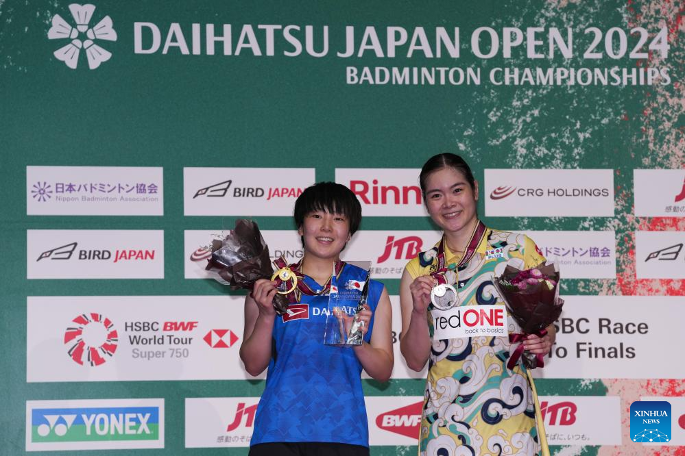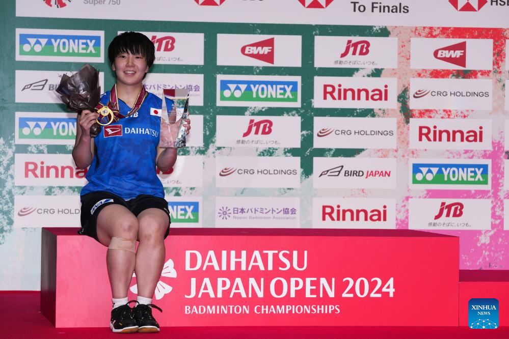 Yamaguchi Akane of Japan poses for photos during the awarding ceremony of women's singles at the Japan Badminton Open 2024 in Yokohama, Japan, Aug. 25, 2024. (Xinhua/Zhang Xiaoyu)