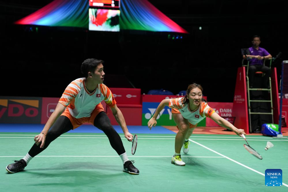 Tang Chun Man (L)/Tse Ying Suet of China's Hong Kong compete during the mixed doubles final match against Jiang Zhenbang/Wei Yaxin of China at the Japan Badminton Open 2024 in Yokohama, Japan, Aug. 25, 2024. (Xinhua/Zhang Xiaoyu)