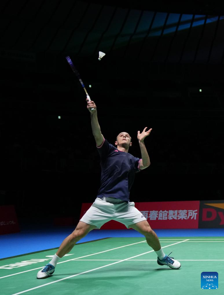 Alex Lanier of France hits a return during the men's singles final match against Chou Tien-Chen of Chinese Taipei at the Japan Badminton Open 2024 in Yokohama, Japan, on Aug. 25, 2024. (Xinhua/Zhang Xiaoyu)