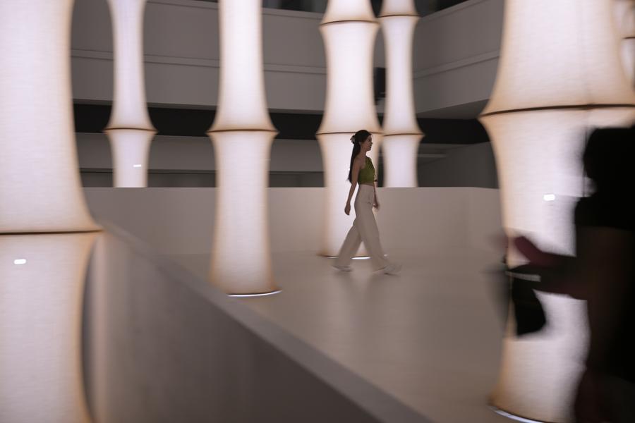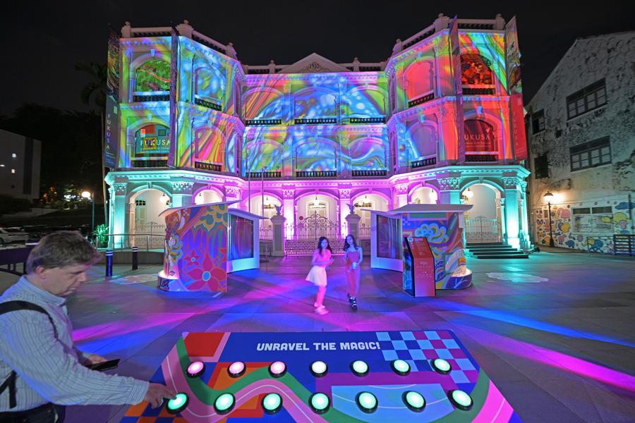 Visitors view a light projection art installation during the media preview of the Singapore Night Festival held in Singapore on Aug. 21, 2024. (Photo by Then Chih Wey/Xinhua)