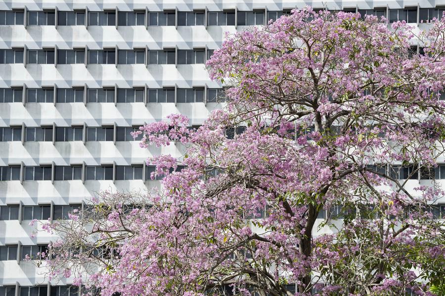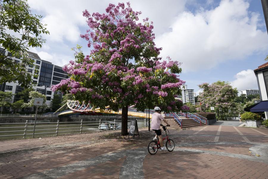 SINGAPORE, Aug. 25 (Xinhua) -- Singapore is currently flourishing with flowers and a festivity vibe during the early time of autumn, with pink blossoms all over the trumpet trees along the Singapore River to add colors to the season, in addition to a night festival of arts during weekends to enrich the cultural landscape and residents' life in this city state.