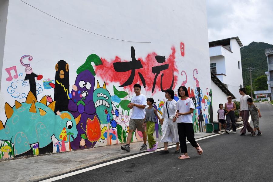 Children and teachers walk past a wall with paintings on it in Youyujing Village, Shuishi Township of Ningyuan County, central China's Hunan Province, on Aug. 25, 2024. (Xinhua/Chen Zhenhai)