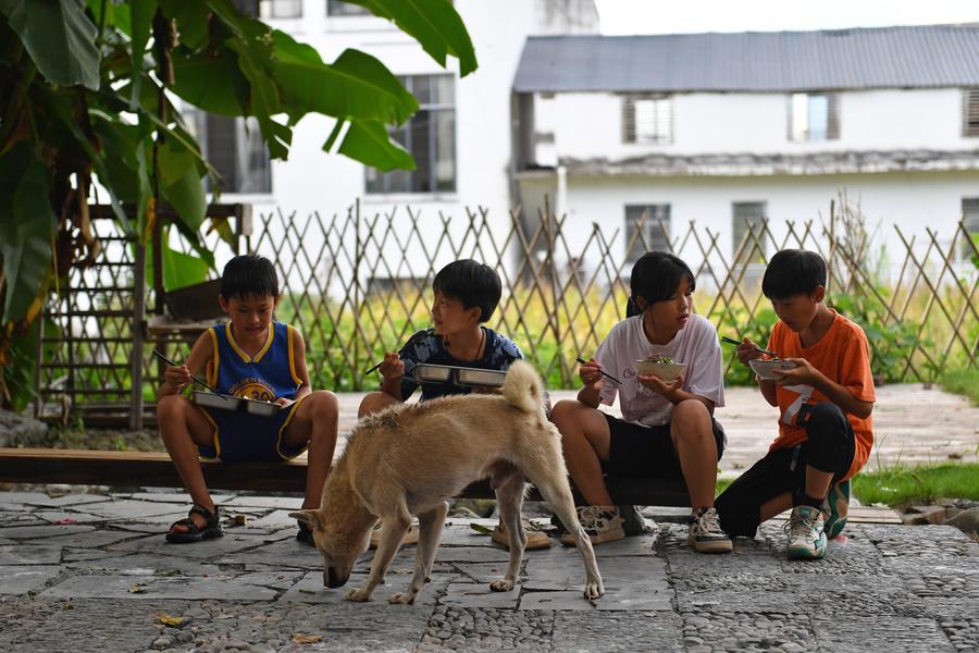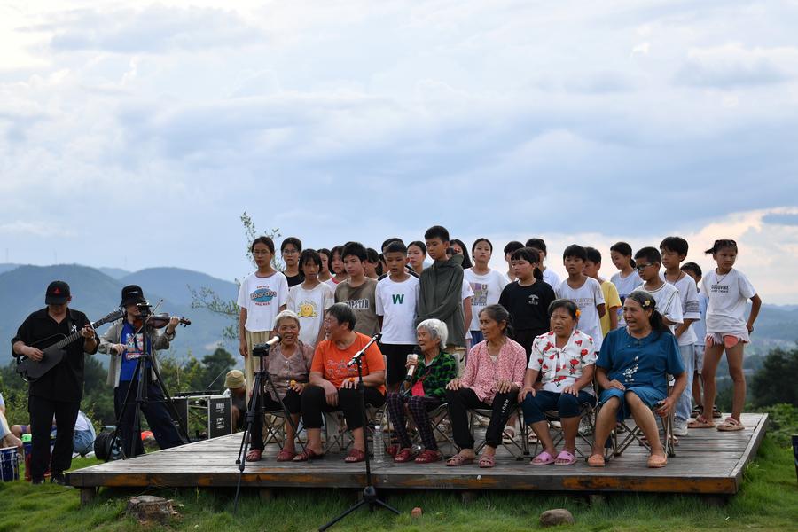 People look at handicrafts made by children from an art and culture exchange center in Youyujing Village, Shuishi Township of Ningyuan County, central China's Hunan Province, Aug. 25, 2024. (Xinhua/Chen Zhenhai)A child displays a design during a rural youth art festival in Youyujing Village, Shuishi Township of Ningyuan County, central China's Hunan Province, on Aug. 25, 2024. (Xinhua/Chen Zhenhai)Children and the elderly perform a chorus during a rural youth art festival in Youyujing Village, Shuishi Township of Ningyuan County, central China's Hunan Province, on Aug. 25, 2024. (Xinhua/Chen Zhenhai)Children of an art and culture exchange center play a game with teachers after supper in Youyujing Village, Shuishi Township of Ningyuan County, central China's Hunan Province, Aug. 24, 2024. (Xinhua/Chen Zhenhai)Children sing a song with the elderly of Yao ethnic group during a rural youth art festival in Youyujing Village, Shuishi Township of Ningyuan County, central China's Hunan Province, on Aug. 25, 2024. (Xinhua/Chen Zhenhai)Children of an art and culture exchange center have supper in Youyujing Village, Shuishi Township of Ningyuan County, central China's Hunan Province, Aug. 24, 2024. (Xinhua/Chen Zhenhai)Children from an art and culture exchange center write verses on stones in Youyujing Village, Shuishi Township of Ningyuan County, central China's Hunan Province, Aug. 25, 2024. (Xinhua/Zhao Zhongzhi)Children prepare for an opera performance during a rural youth art festival in Youyujing Village, Shuishi Township of Ningyuan County, central China's Hunan Province, on Aug. 25, 2024. (Xinhua/Zhao Zhongzhi)Teachers from an art and culture exchange center establish an installation in Youyujing Village, Shuishi Township of Ningyuan County, central China's Hunan Province, on Aug. 25, 2024. (Xinhua/Chen Zhenhai)■