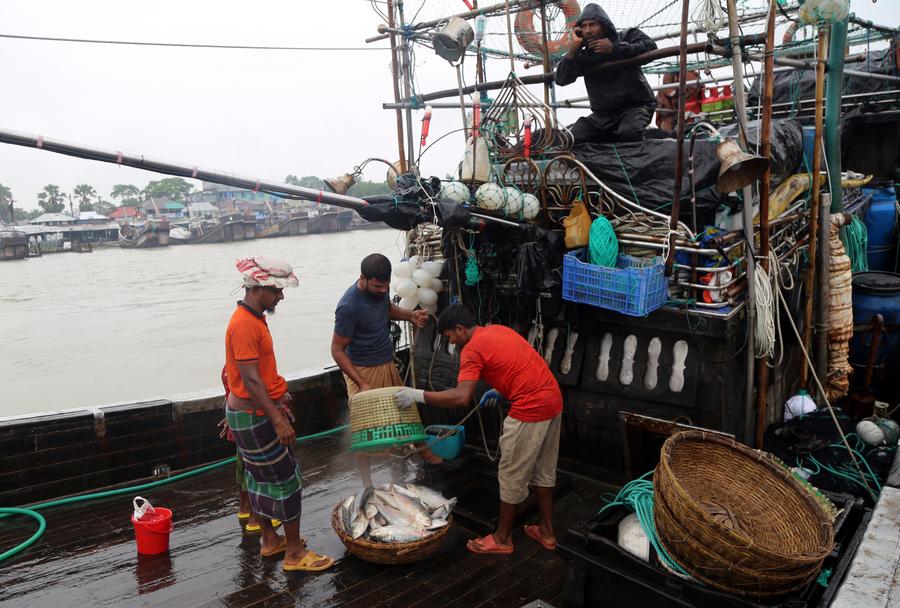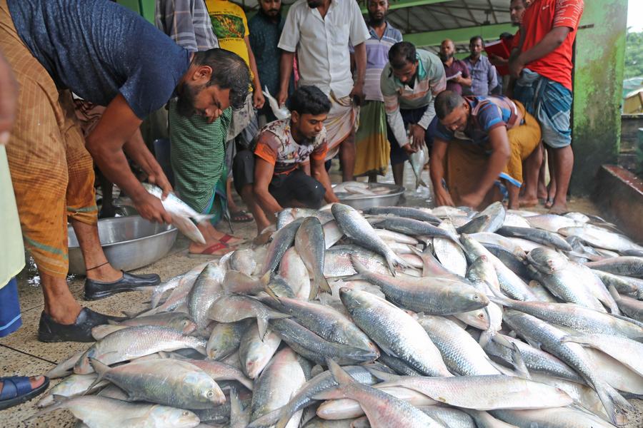 Workers process Hilsa fish at a fish landing station in Patuakhali, Bangladesh, Aug. 24, 2024. (Xinhua)Workers process Hilsa fish at a fish landing station in Patuakhali, Bangladesh, Aug. 24, 2024. (Xinhua)Fishermen catch Hilsa fish at a major fish landing station in Patuakhali, Bangladesh, Aug. 24, 2024. (Xinhua)■