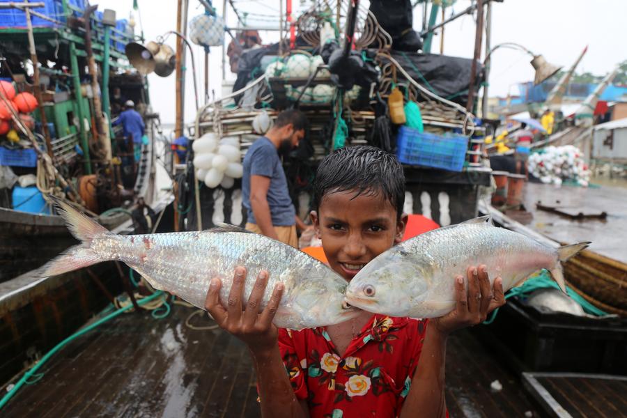 A boy shows Hilsa fish in Patuakhali, Bangladesh, Aug. 24, 2024. (Xinhua)