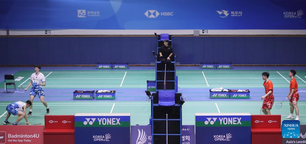 Huang Di (R)/Zhou Haodong of China compete during the men's doubles first round match against Chen Boyang/Liu Yi of China at the BWF Korea Open Badminton Championships 2024 in Mokpo, South Korea, Aug. 27, 2024. (Xinhua/Yao Qilin)