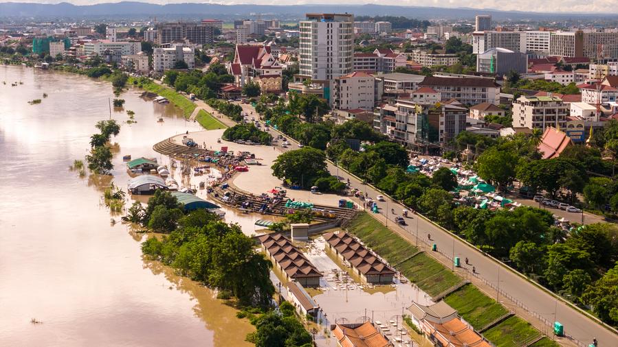A drone photo taken on Aug. 26, 2024, shows rising water in the Mekong River in Vientiane, the capital of Laos. (Photo by Kaikeo Saiyasane/Xinhua)