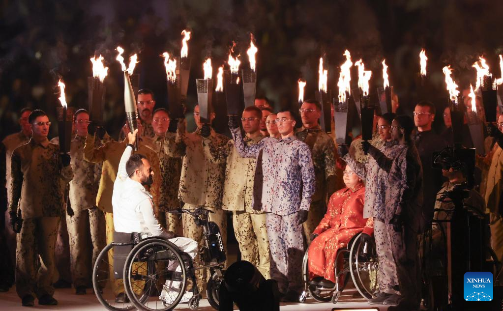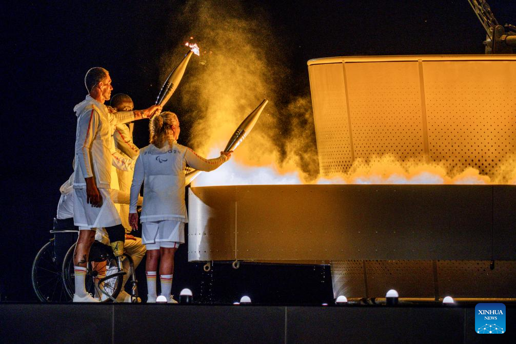 Torch bearers light up the Paralympic cauldron during the opening ceremony of the Paris 2024 Paralympic Games in Paris, France, Aug. 28, 2024. (Xinhua/Huang Wei)