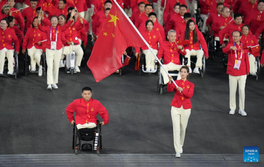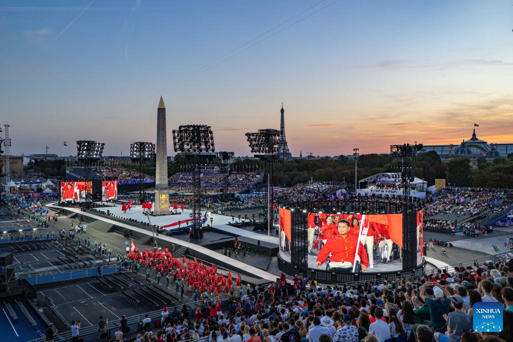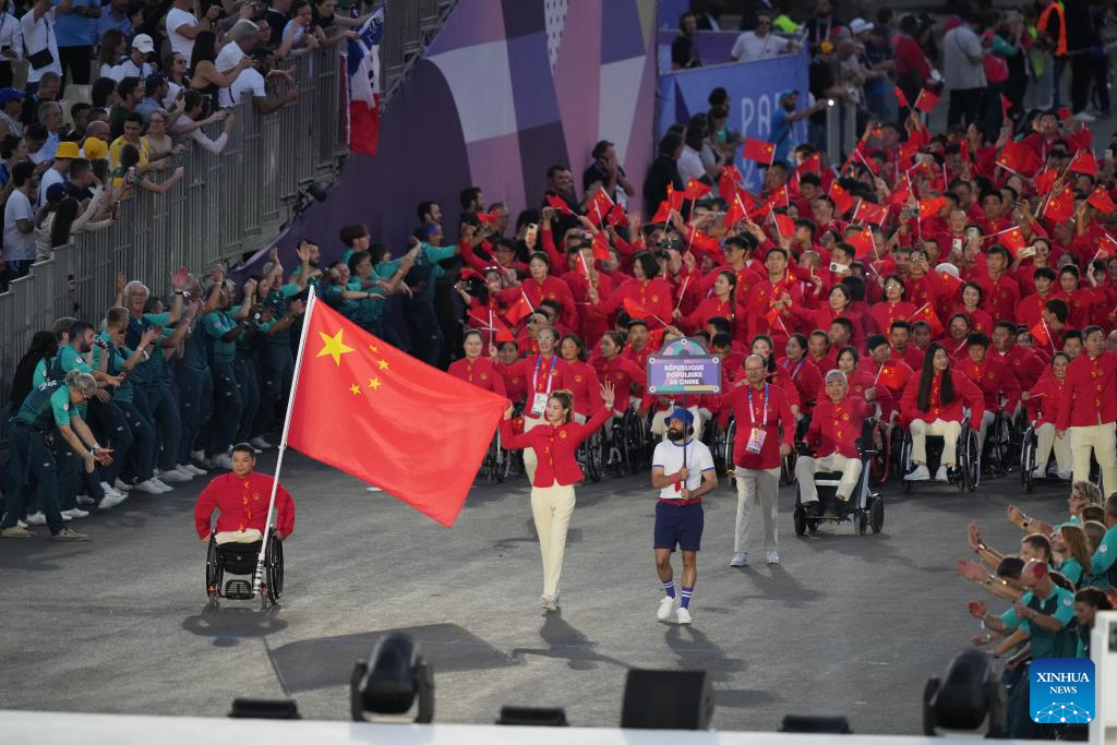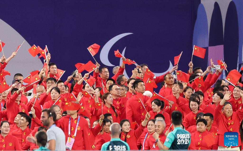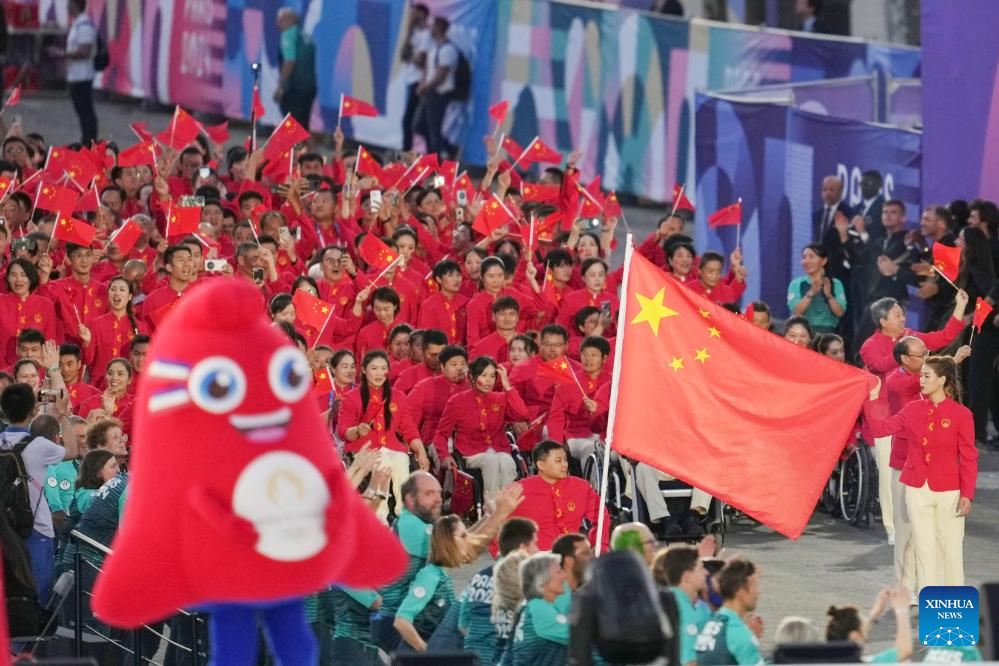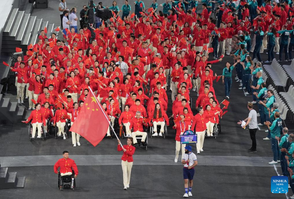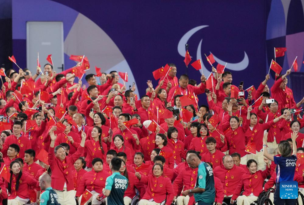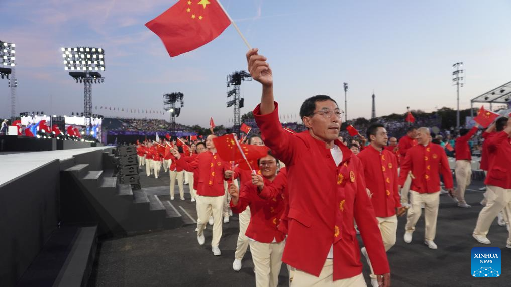 Members of the Chinese delegation are seen during the opening ceremony of the Paris 2024 Paralympic Games in Paris, France, Aug. 28, 2024. (Xinhua/Huang Wei)