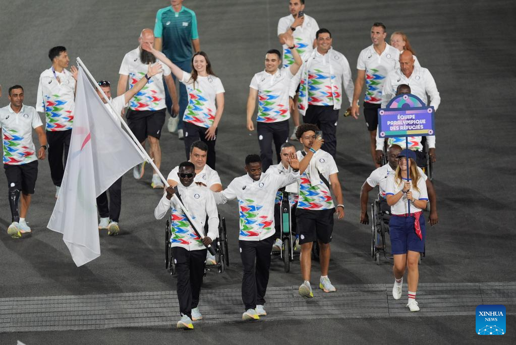 Members of the Refugee Paralympic Team arrive for the opening ceremony of the Paris 2024 Paralympic Games in Paris, France, Aug. 28, 2024. (Xinhua/Cai Yang)