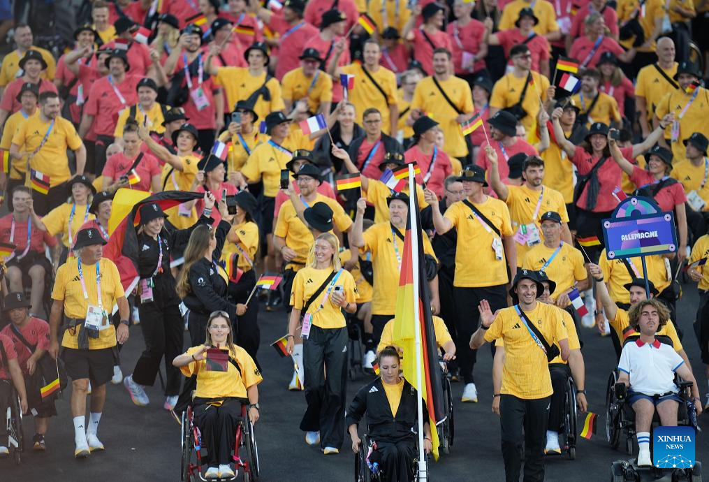 Members of the delegation of Germany arrive for the opening ceremony of the Paris 2024 Paralympic Games in Paris, France, Aug. 28, 2024. (Xinhua/Hou Zhaokang)