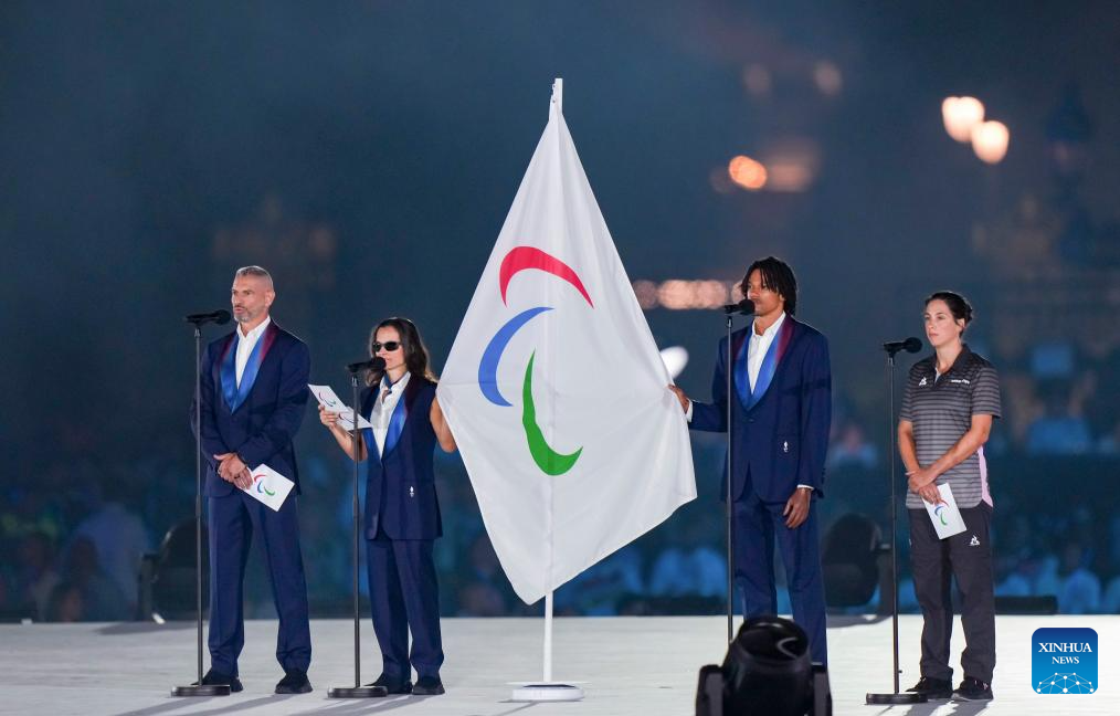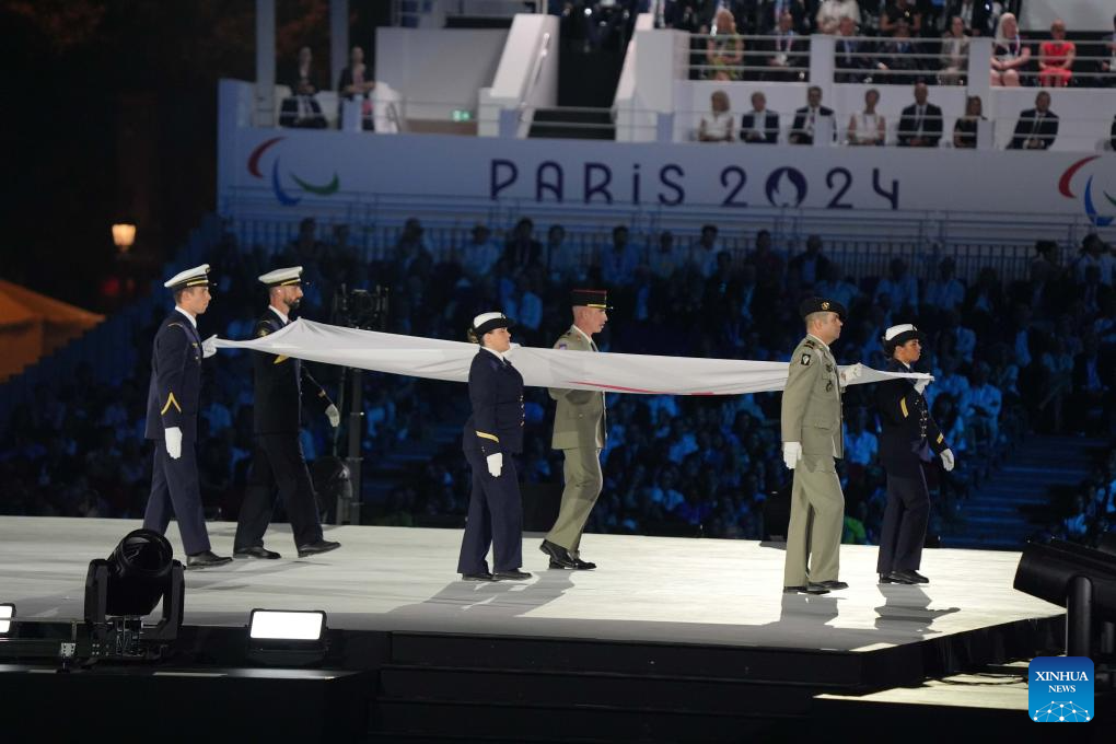 The Paralympic flag is held by military personnel during the opening ceremony of the Paris 2024 Paralympic Games in Paris, France, Aug. 28, 2024. (Xinhua/Xing Guangli)