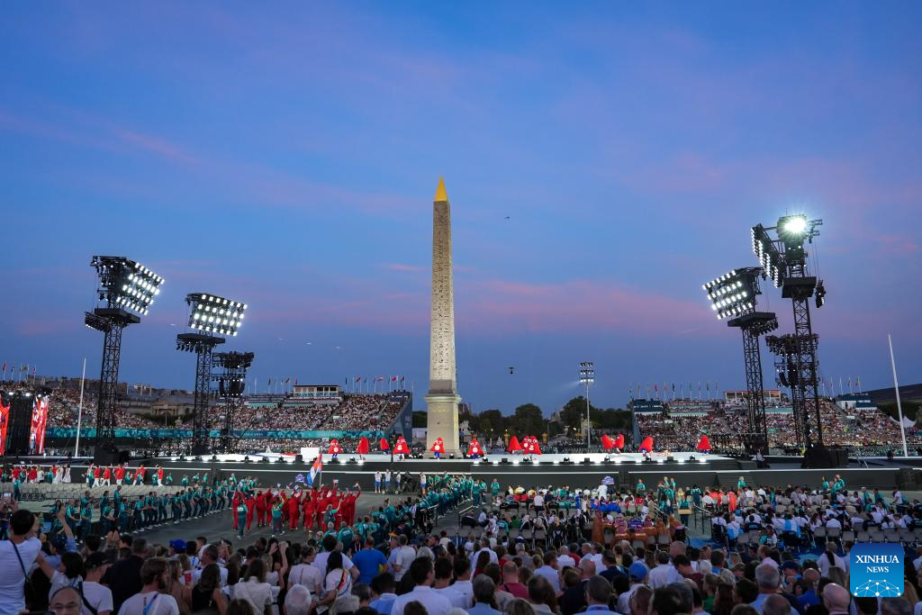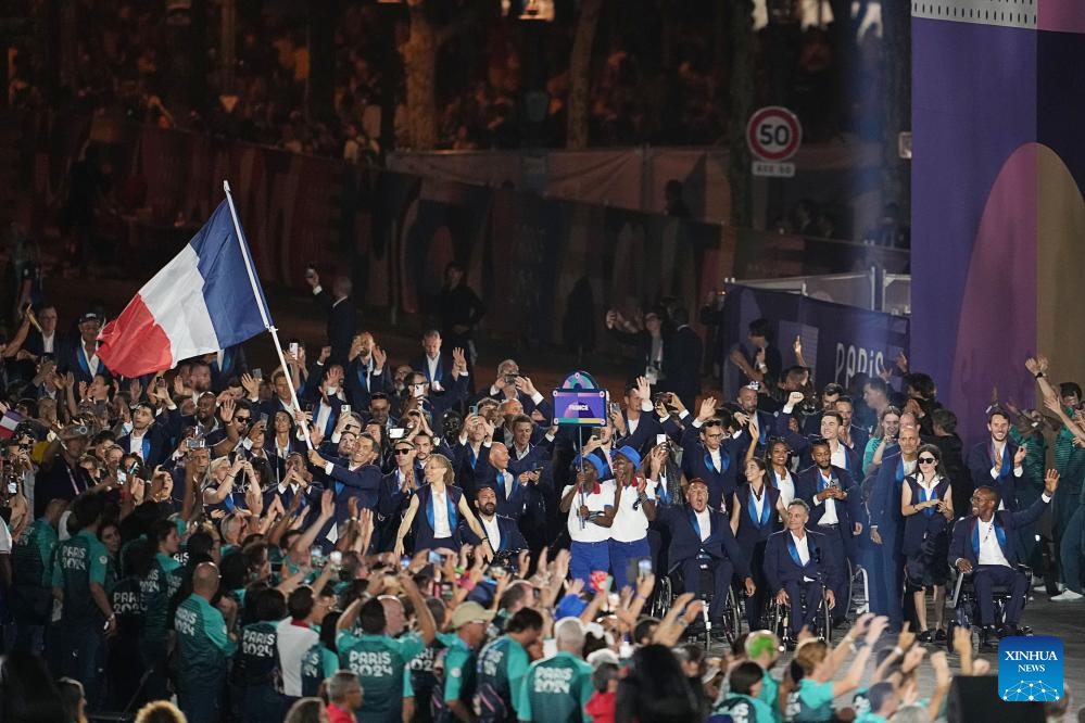 Members of the delegation of France arrive for the opening ceremony of the Paris 2024 Paralympic Games in Paris, France, Aug. 28, 2024. (Xinhua/Xiong Qi)