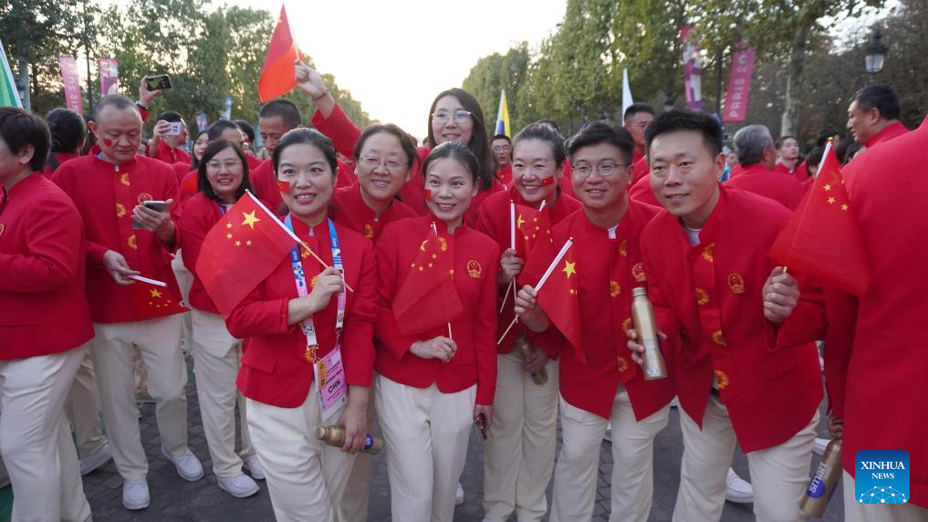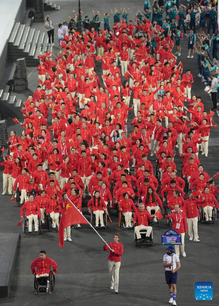 Members of the Chinese delegation arrive for the opening ceremony of the Paris 2024 Paralympic Games in Paris, France, Aug. 28, 2024. (Xinhua/Cai Yang)