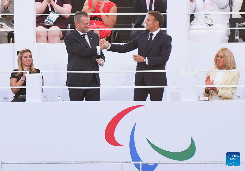 French President Emmanuel Macron (2nd R) shakes hands with President of the International Paralympic Committee Andrew Parsons (2nd L) during the opening ceremony of the Paris 2024 Paralympic Games in Paris, France, Aug. 28, 2024. (Xinhua/Xing Guangli)