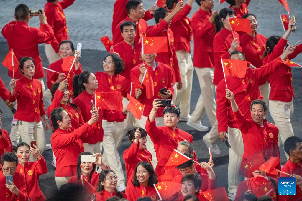 Members of the Chinese delegation arrive for the opening ceremony of the Paris 2024 Paralympic Games in Paris, France, Aug. 28, 2024. (Xinhua/Xiong Qi)