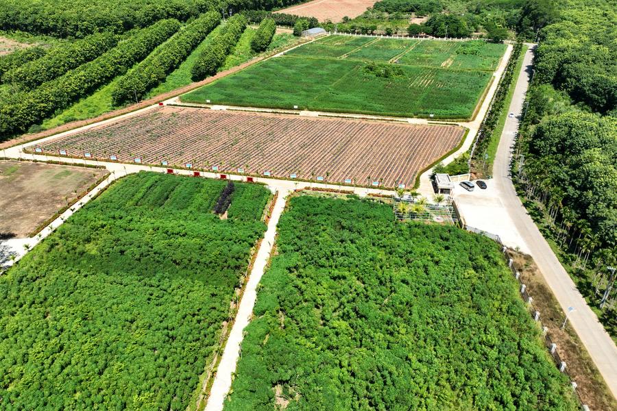 Cassava-based food products are pictured at the Danzhou campus of Chinese Academy of Tropical Agricultural Sciences in Danzhou, south China's Hainan Province, July 10, 2024. (Xinhua/Zhang Liyun)An aerial drone photo taken on July 10, 2024 shows a view of the National Cassava Germplasm Repository in Danzhou, south China's Hainan Province. (Xinhua/Zhang Liyun)A researcher works on subculture of cassava in a lab at the Danzhou campus of Chinese Academy of Tropical Agricultural Sciences in Danzhou, south China's Hainan Province, July 10, 2024. (Xinhua/Zhang Liyun)Researchers observe cassava seedlings at a lab at the Danzhou campus of Chinese Academy of Tropical Agricultural Sciences in Danzhou, south China's Hainan Province, July 10, 2024. (Xinhua/Zhang Liyun)Cassava seedlings are pictured at the Danzhou campus of Chinese Academy of Tropical Agricultural Sciences in Danzhou, south China's Hainan Province, July 10, 2024. (Xinhua/Zhang Liyun)