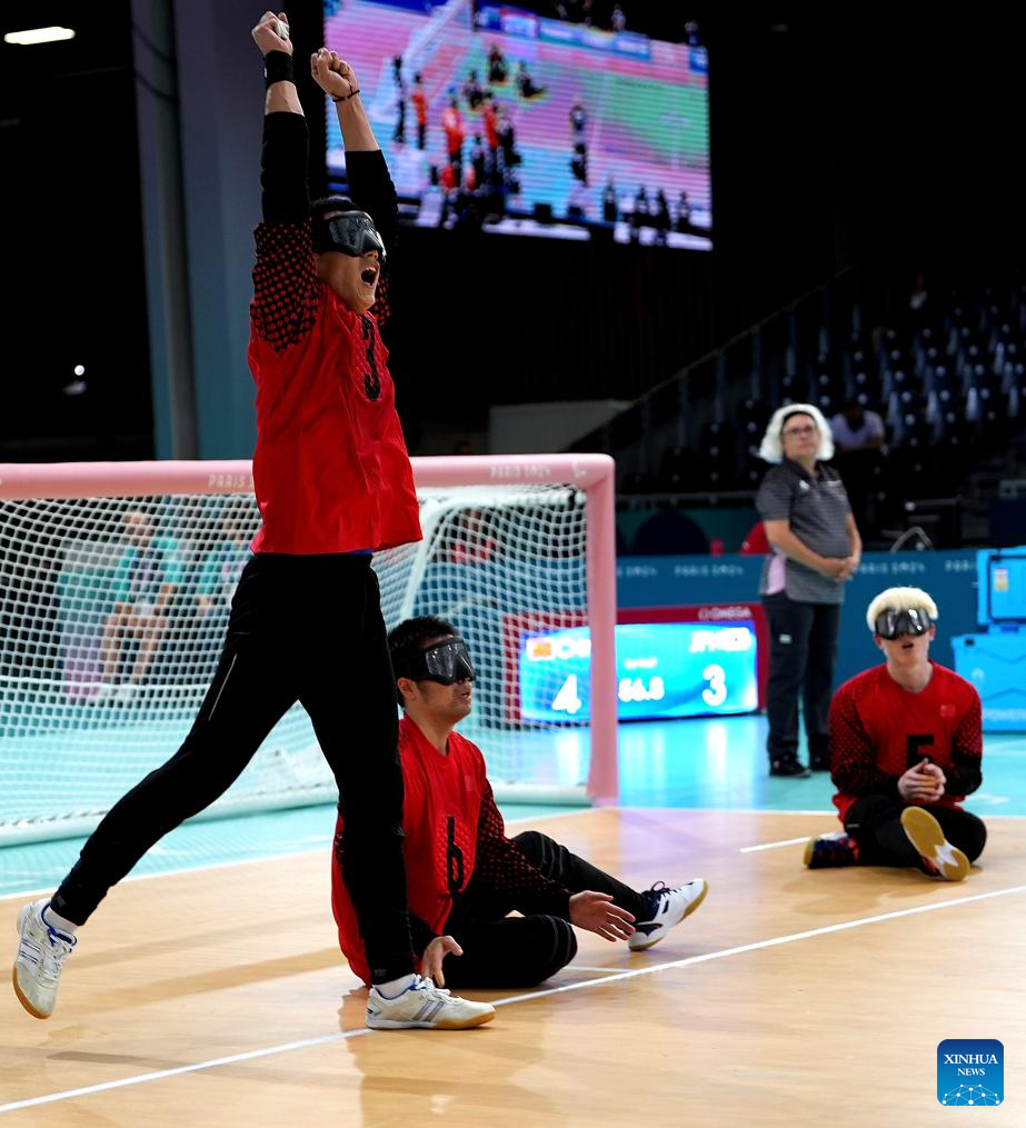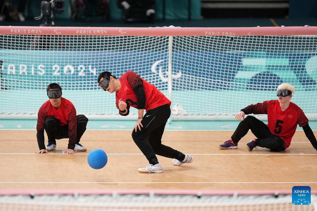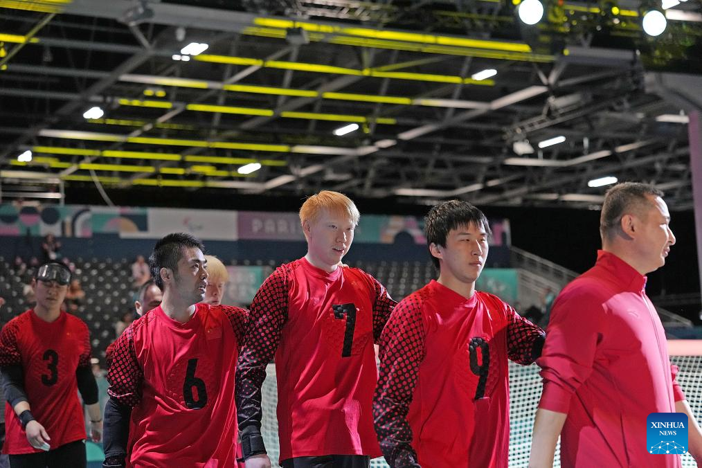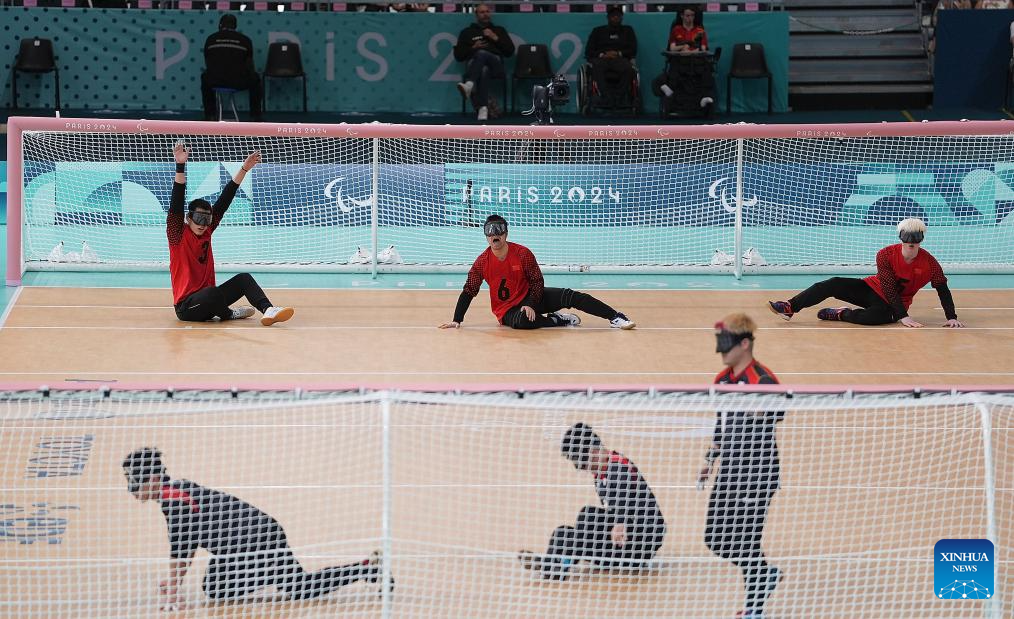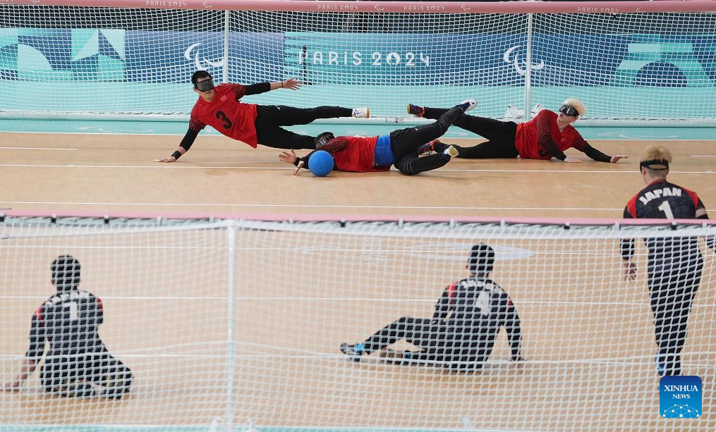 Yang Mingyuan (C) of China shoots during the Goalball Men's Preliminary Round Pool B Game between China and Japan at the Paris 2024 Paralympic Games in Paris, France, Aug. 29, 2024. (Xinhua/Hou Zhaokang)