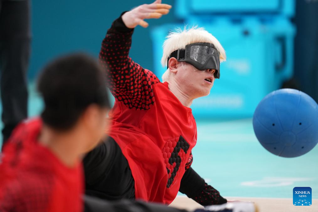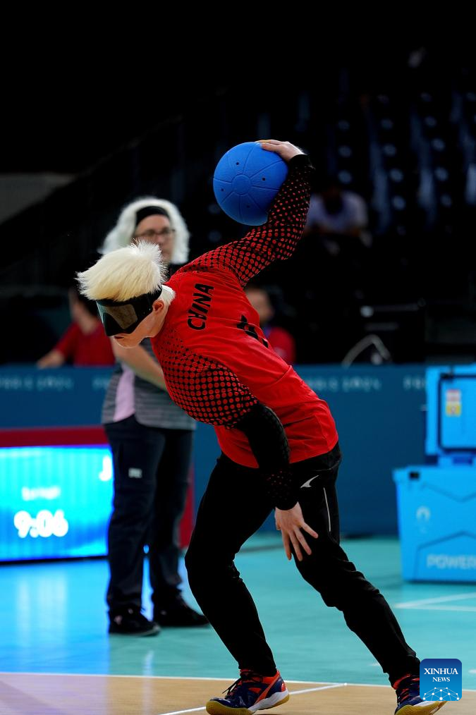 Hu Mingyao of China shoots during the Goalball Men's Preliminary Round Pool B Game between China and Japan at the Paris 2024 Paralympic Games in Paris, France, Aug. 29, 2024. (Xinhua/Hou Zhaokang)