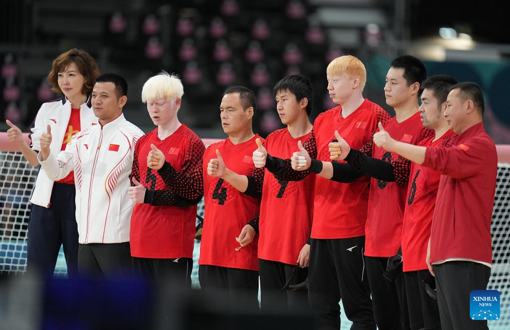 Team China pose after the Goalball Men's Preliminary Round Pool B Game between China and Japan at the Paris 2024 Paralympic Games in Paris, France, Aug. 29, 2024. (Xinhua/Hou Zhaokang)