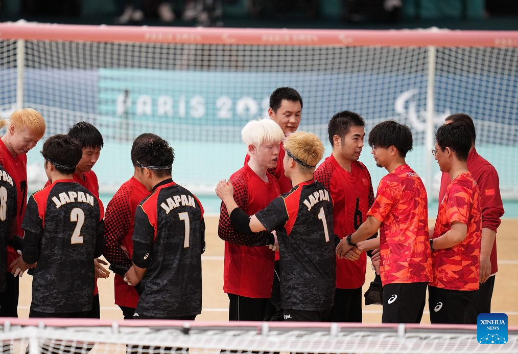 Players from both teams greet each other after the Goalball Men's Preliminary Round Pool B Game between China and Japan at the Paris 2024 Paralympic Games in Paris, France, Aug. 29, 2024. (Xinhua/Hou Zhaokang)