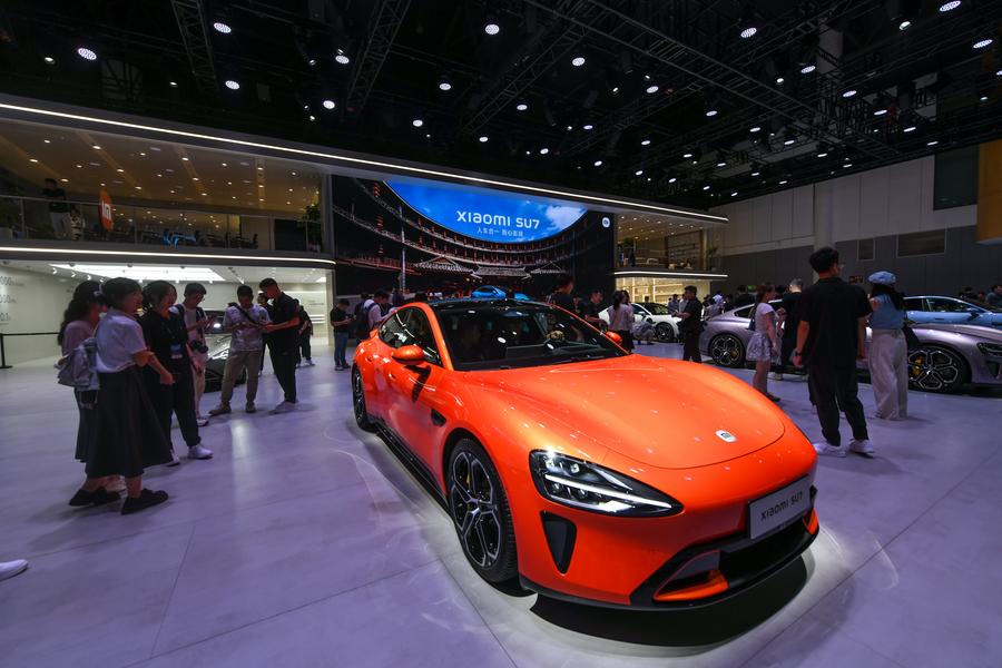 A Xiaomi SU7 car is on display during Chengdu Motor Show 2024 in Chengdu, southwest China's Sichuan Province, Aug. 30, 2024. (Xinhua/Tang Wenhao)