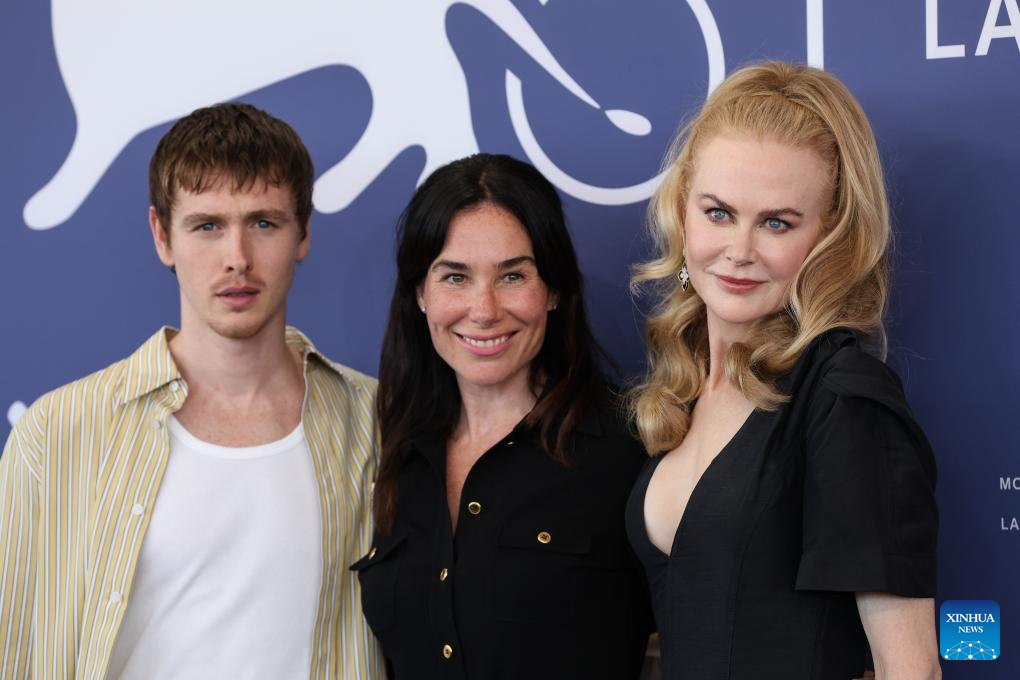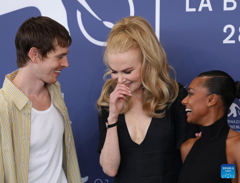Harris Dickinson, Nicole Kidman, and Sophie Wilde (L to R) of the film "Babygirl" pose for the photocall during the 81st Venice Film Festival in Venice, Italy, Aug. 30, 2024. (Xinhua/Li Jing)