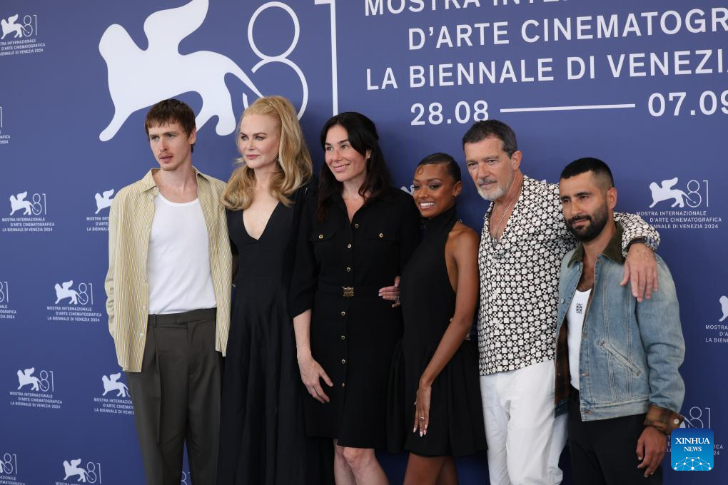 Harris Dickinson, Nicole Kidman, Halina Reijn, Sophie Wilde, Antonio Banderas and David Hinojosa (L to R) of the film "Babygirl" pose for the photocall during the 81st Venice Film Festival in Venice, Italy, Aug. 30, 2024. (Xinhua/Li Jing)