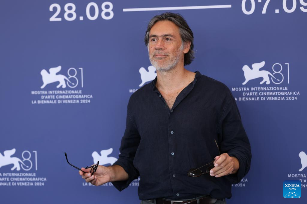 Director Emmanuel Mouret of the film "Trois Amies" (Three Friends) poses for the photocall during the 81st Venice Film Festival in Venice, Italy, Aug. 29, 2024. (Xinhua/Li Jing)