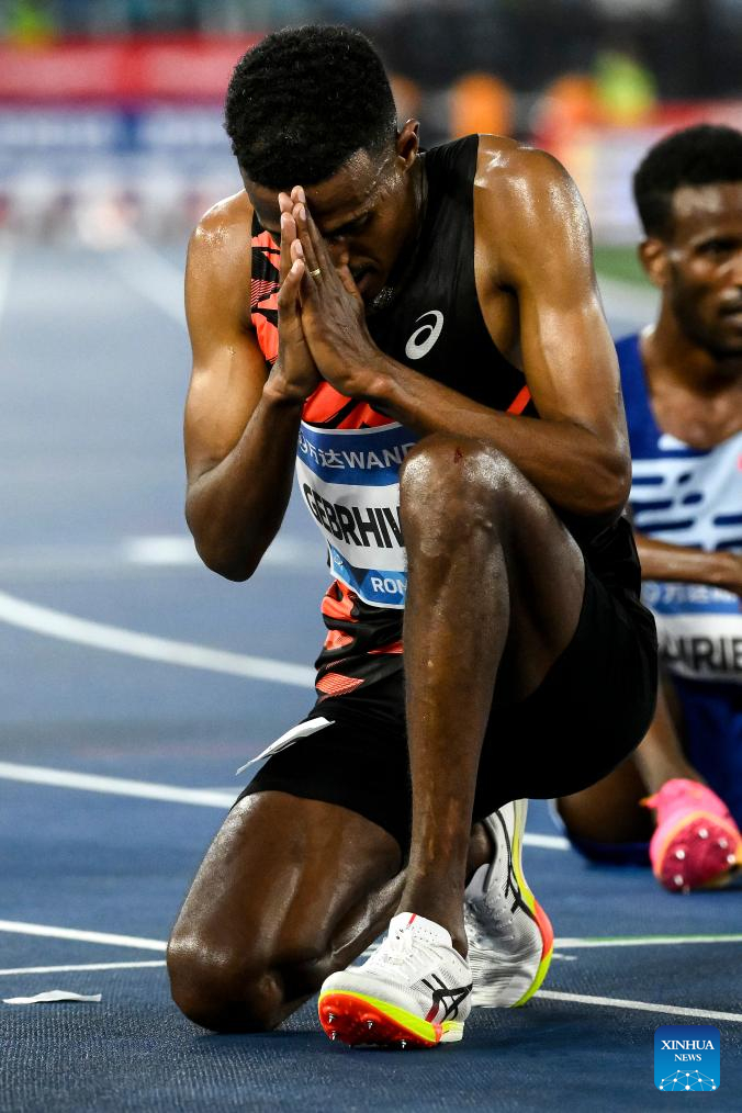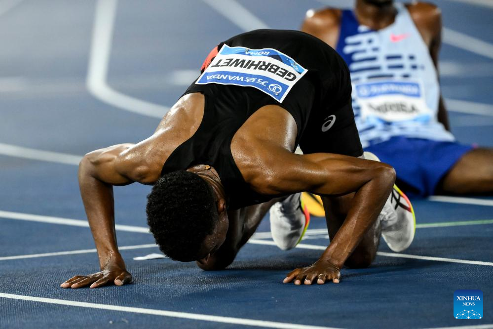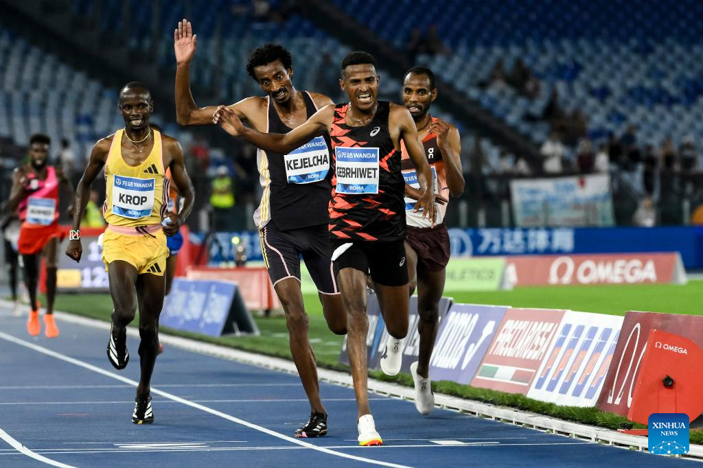 Hagos Gebrhiwet of Ethiopia celebrates after the men's 5000m final at the 2024 Diamond League Rome Meeting in Rome, Italy, Aug. 30, 2024. (Photo by Andrea Staccioli/Xinhua)