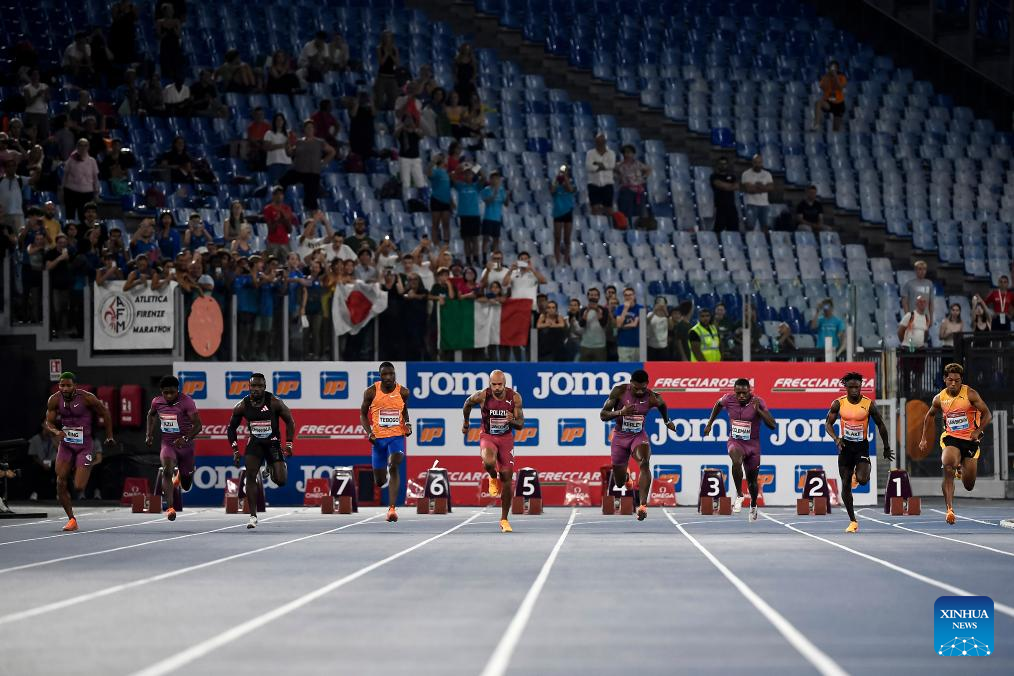 Letsile Tebogo (4th L) of Botswana, Christian Coleman (3rd R) of the United States and Fred Kerley (4th R) of the United States compete during the men's 100m final at the 2024 Diamond League Rome Meeting in Rome, Italy, Aug. 30, 2024. (Photo by Andrea Staccioli/Xinhua)