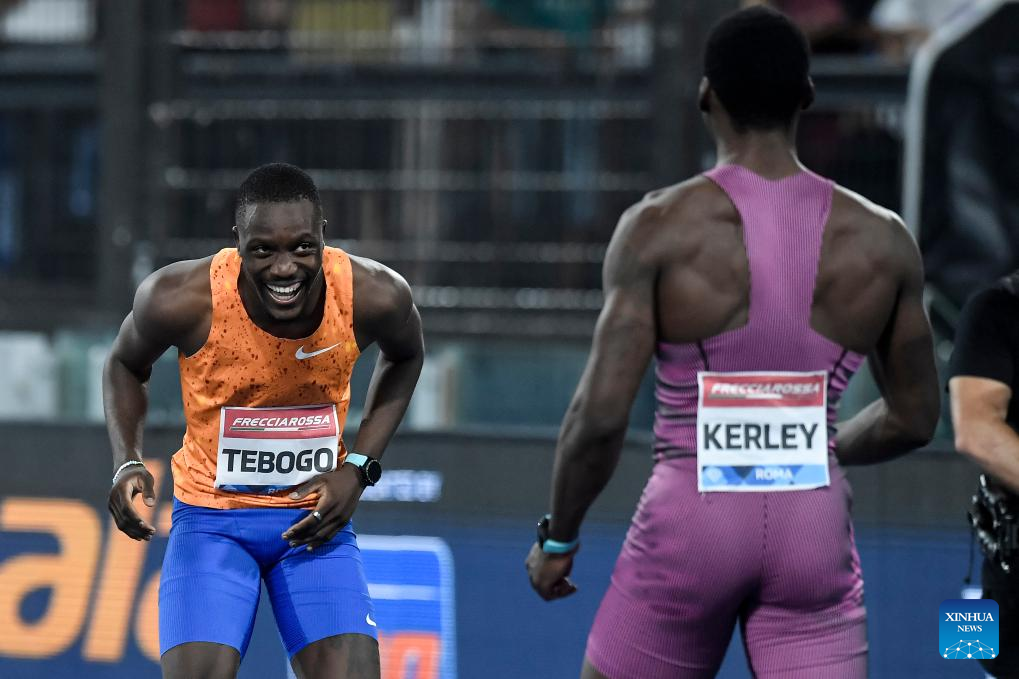 Letsile Tebogo (L) of Botswana celebrates after the men's 100m final at the 2024 Diamond League Rome Meeting in Rome, Italy, Aug. 30, 2024. (Photo by Andrea Staccioli/Xinhua)