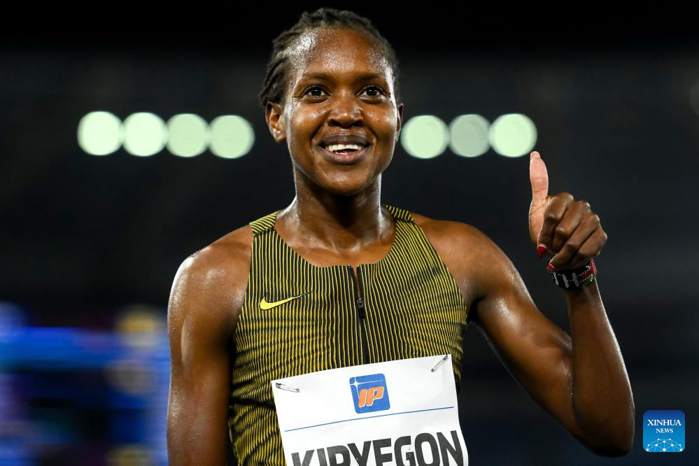 Faith Kipyegon of Kenya celebrates after the women's 1500m final at the 2024 Diamond League Rome Meeting in Rome, Italy, Aug. 30, 2024. (Photo by Andrea Staccioli/Xinhua)