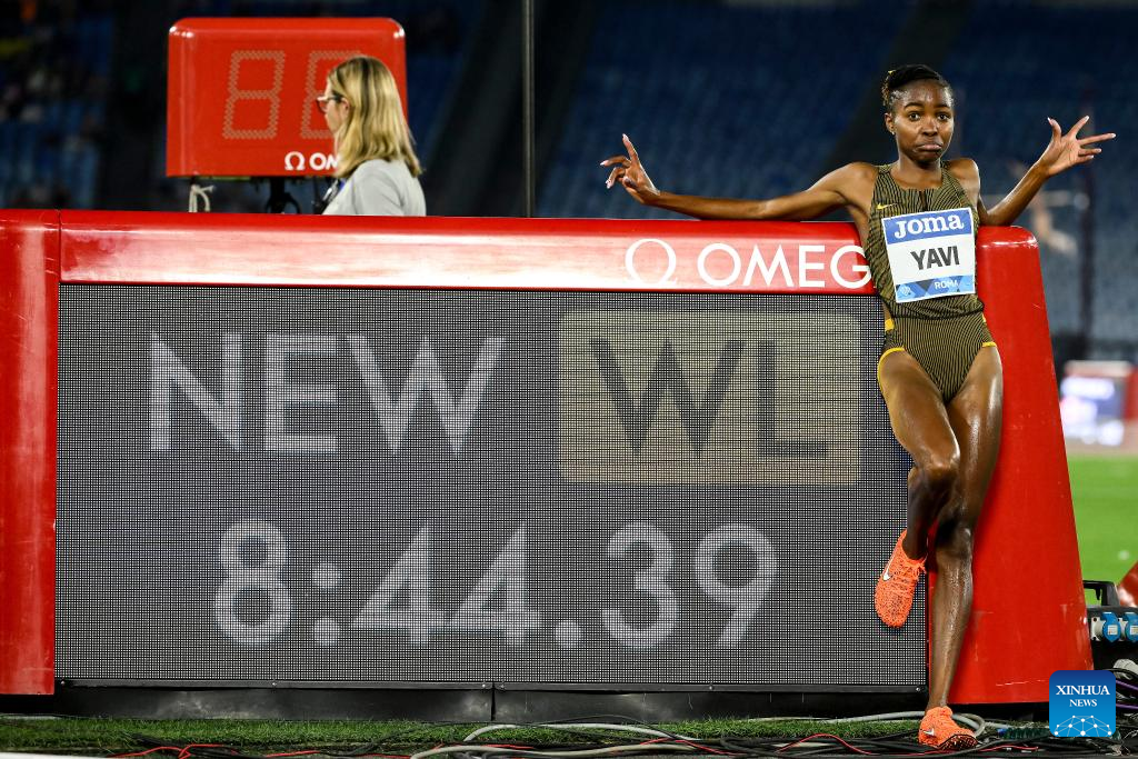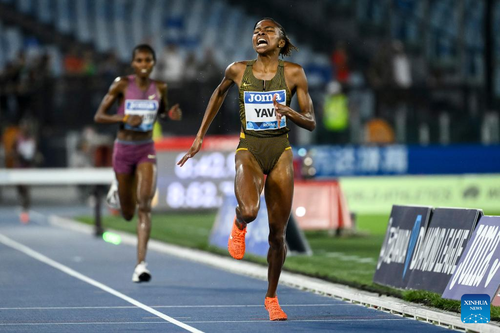 Winfred Yavi of Bahrain celebrates after the women's 3000m steeplechase final at the 2024 Diamond League Rome Meeting in Rome, Italy, Aug. 30, 2024. (Photo by Andrea Staccioli/Xinhua)