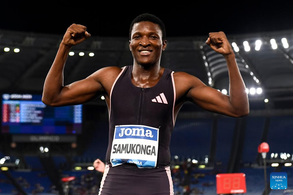 Muzala Samukonga of Zambia celebrates after the men's 400m final at the 2024 Diamond League Rome Meeting in Rome, Italy, Aug. 30, 2024. (Photo by Andrea Staccioli/Xinhua)