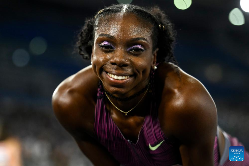 Brittany Brown of the United States reacts after the women's 200m final at the 2024 Diamond League Rome Meeting in Rome, Italy, Aug. 30, 2024. (Photo by Andrea Staccioli/Xinhua)