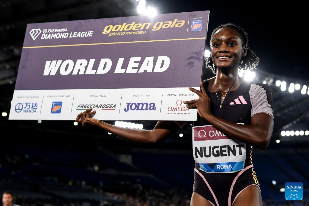 Ackera Nugent of Jamaica celebrates after the women's 100m hurdles final at the 2024 Diamond League Rome Meeting in Rome, Italy, Aug. 30, 2024. (Photo by Andrea Staccioli/Xinhua)