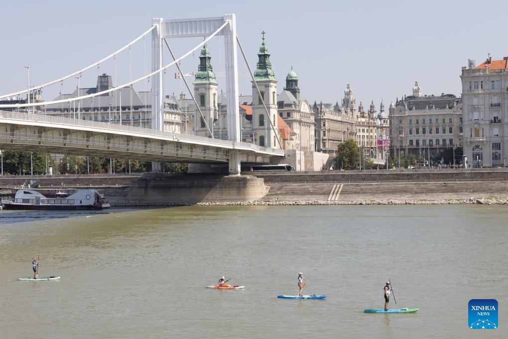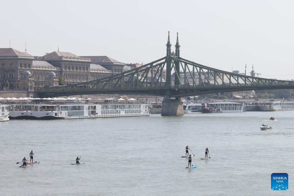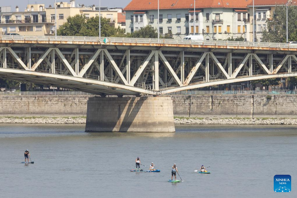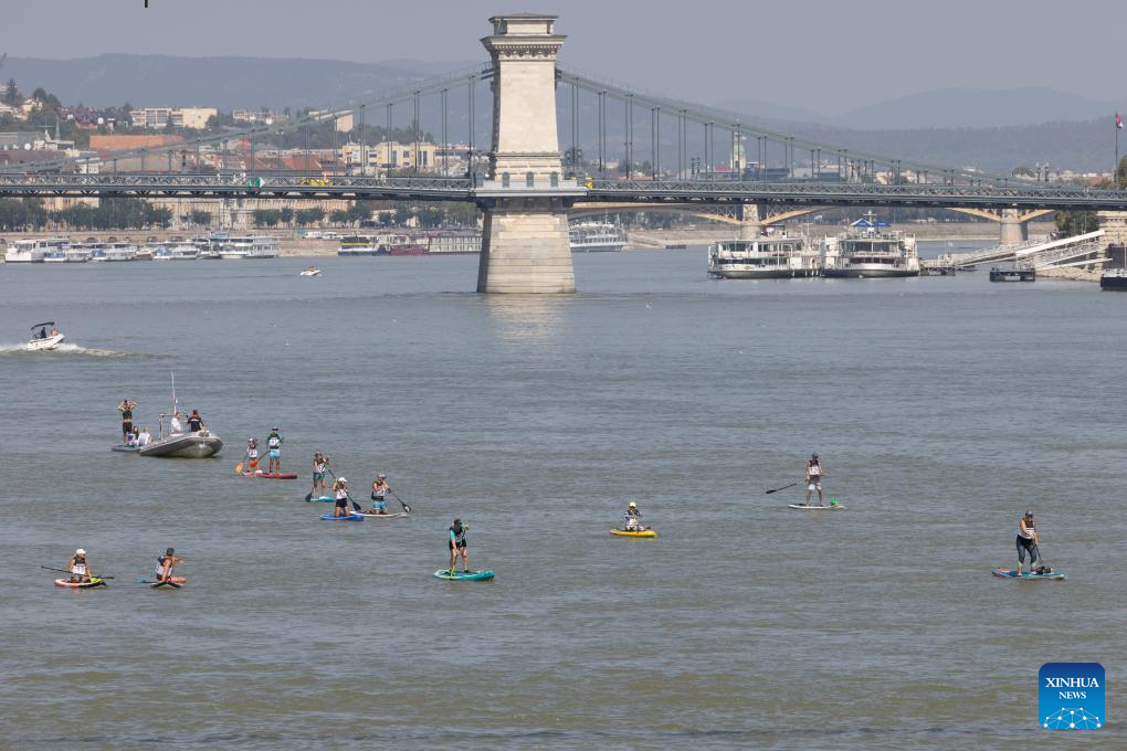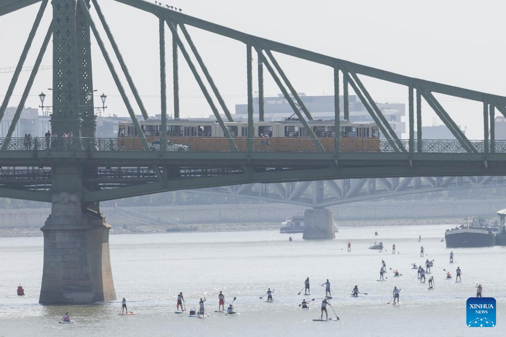 People participate in the Crossing Budapest SUP (stand-up paddle) race on the Danube River in Budapest, Hungary, Sept. 1, 2024. (Photo by Attila Volgyi/Xinhua)