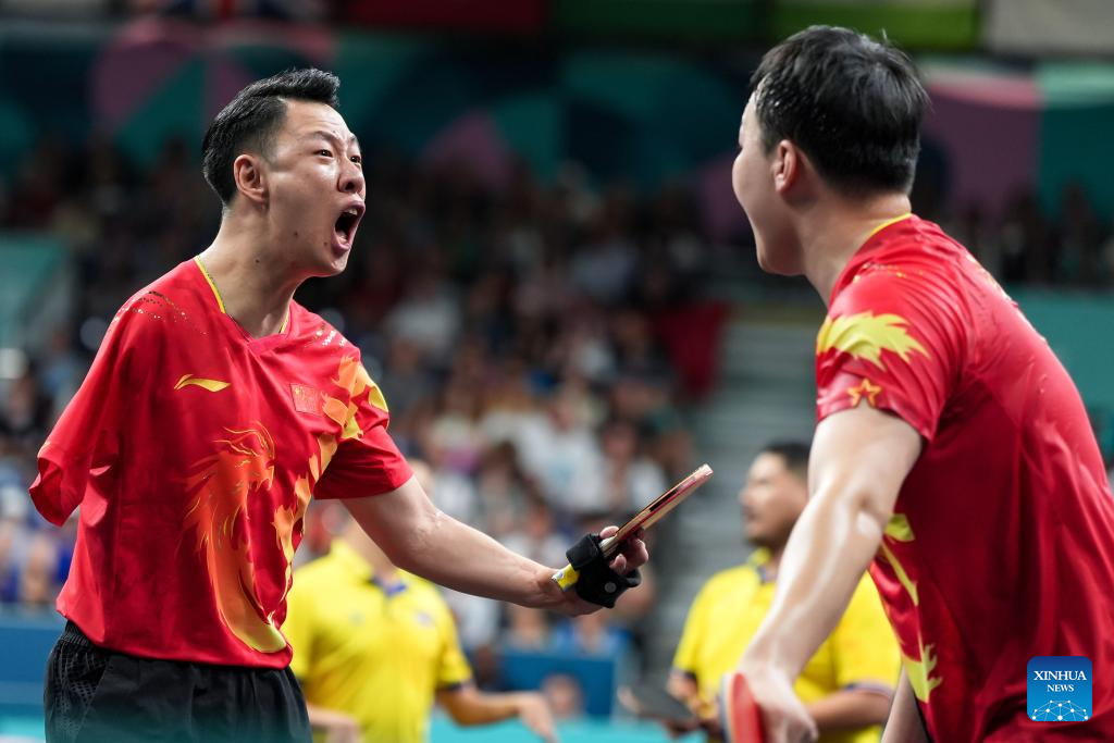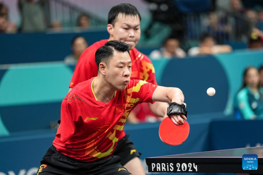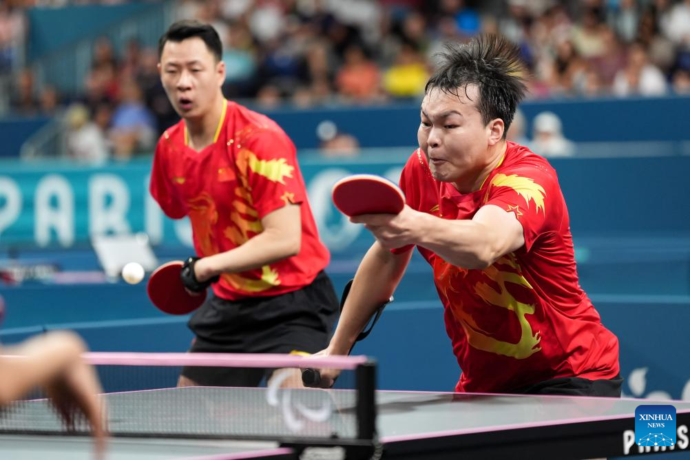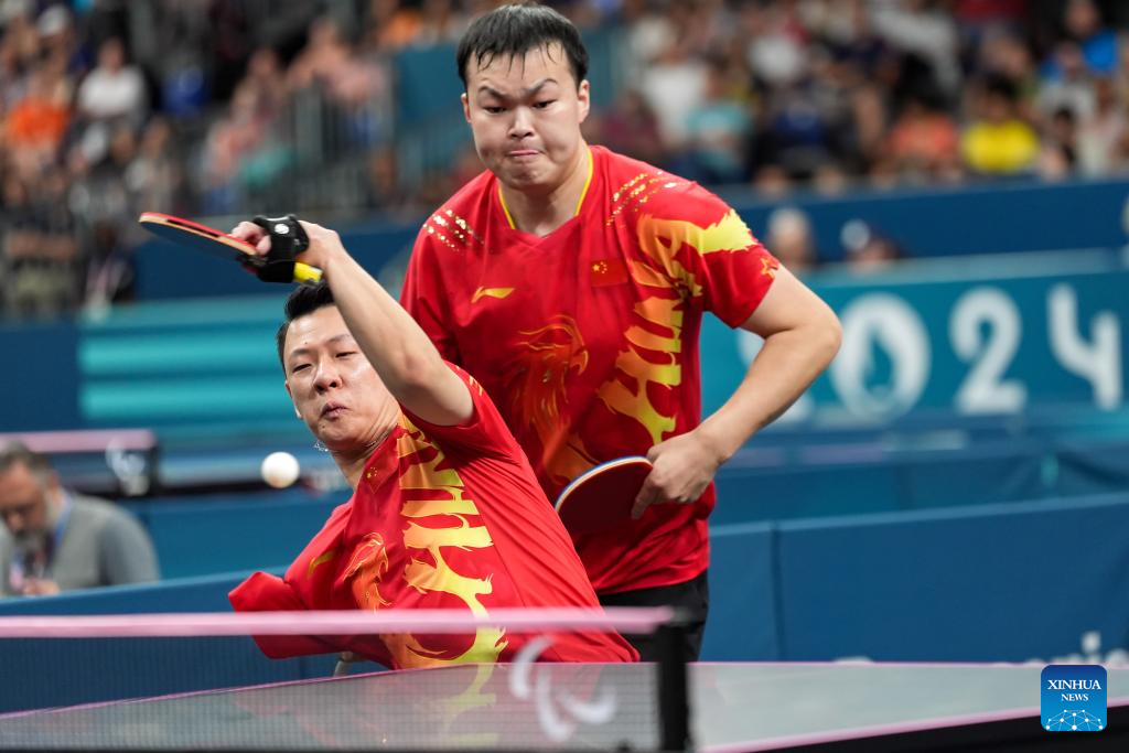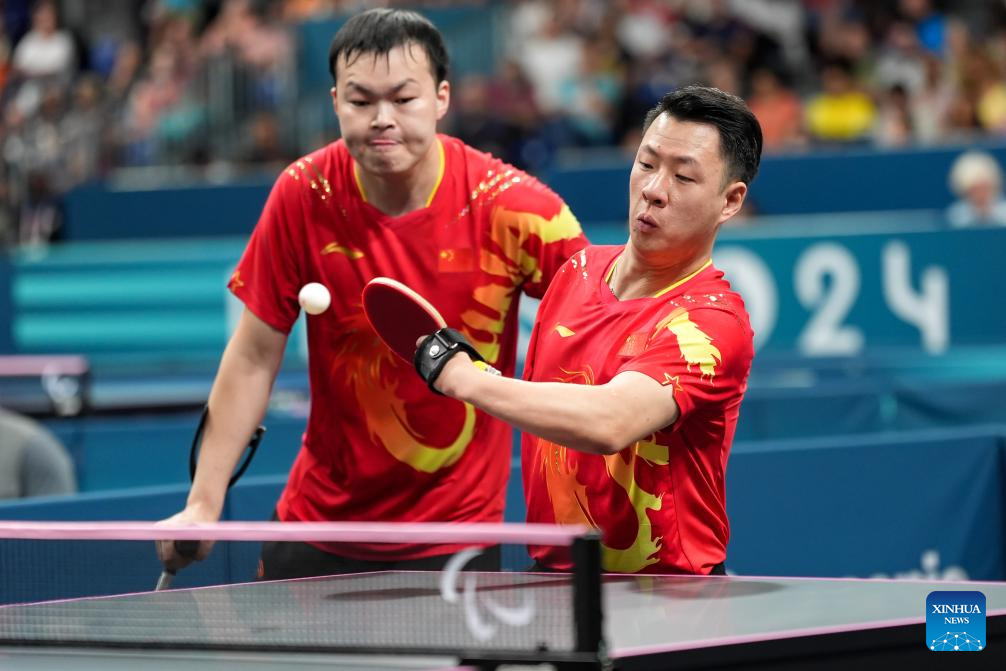 Liao Keli/Yan Shuo (L) of China compete during the Para Table Tennis Men's Doubles MD14 final against Rungroj Thainiyom/Phisit Wangphonphathanasiri of Thailand at the Paris 2024 Paralympic Games in Paris, France, Sept. 1, 2024. (Xinhua/Zhang Cheng)