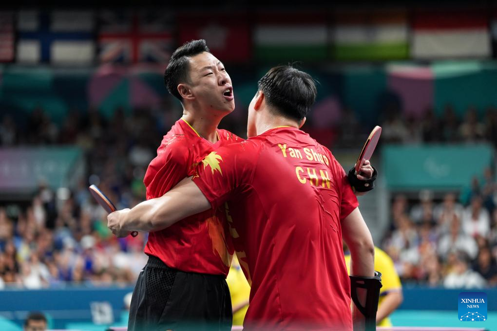 Liao Keli (L)/Yan Shuo of China celebrate after winning the Para Table Tennis Men's Doubles MD14 final against Rungroj Thainiyom/Phisit Wangphonphathanasiri of Thailand at the Paris 2024 Paralympic Games in Paris, France, Sept. 1, 2024. (Xinhua/Zhang Cheng)